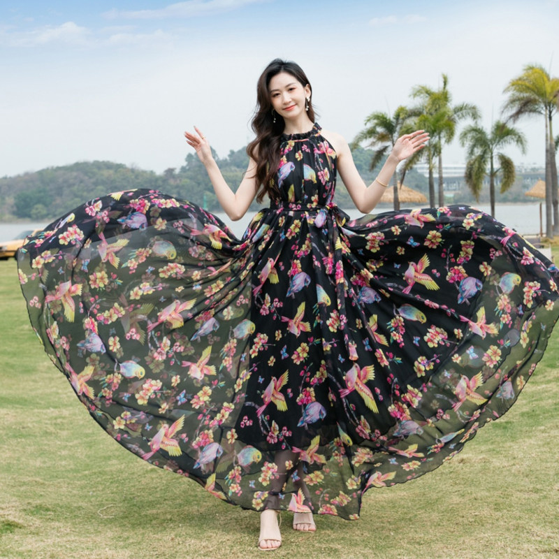吊带碎花雪纺连衣裙大码长款大摆波西米亚度假沙滩裙挂脖长裙夏款