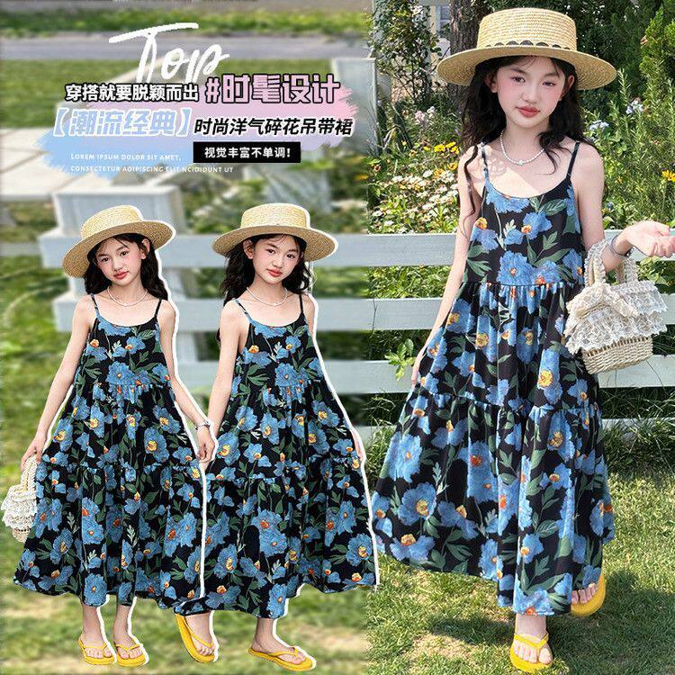 女童吊带连衣裙长款碎花裙中大童小女孩时尚波西米亚风度假沙滩裙