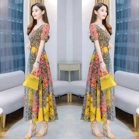 外贸大码薄款宽松显瘦波西米亚度假风沙滩裙长款连衣裙黄色花长裙