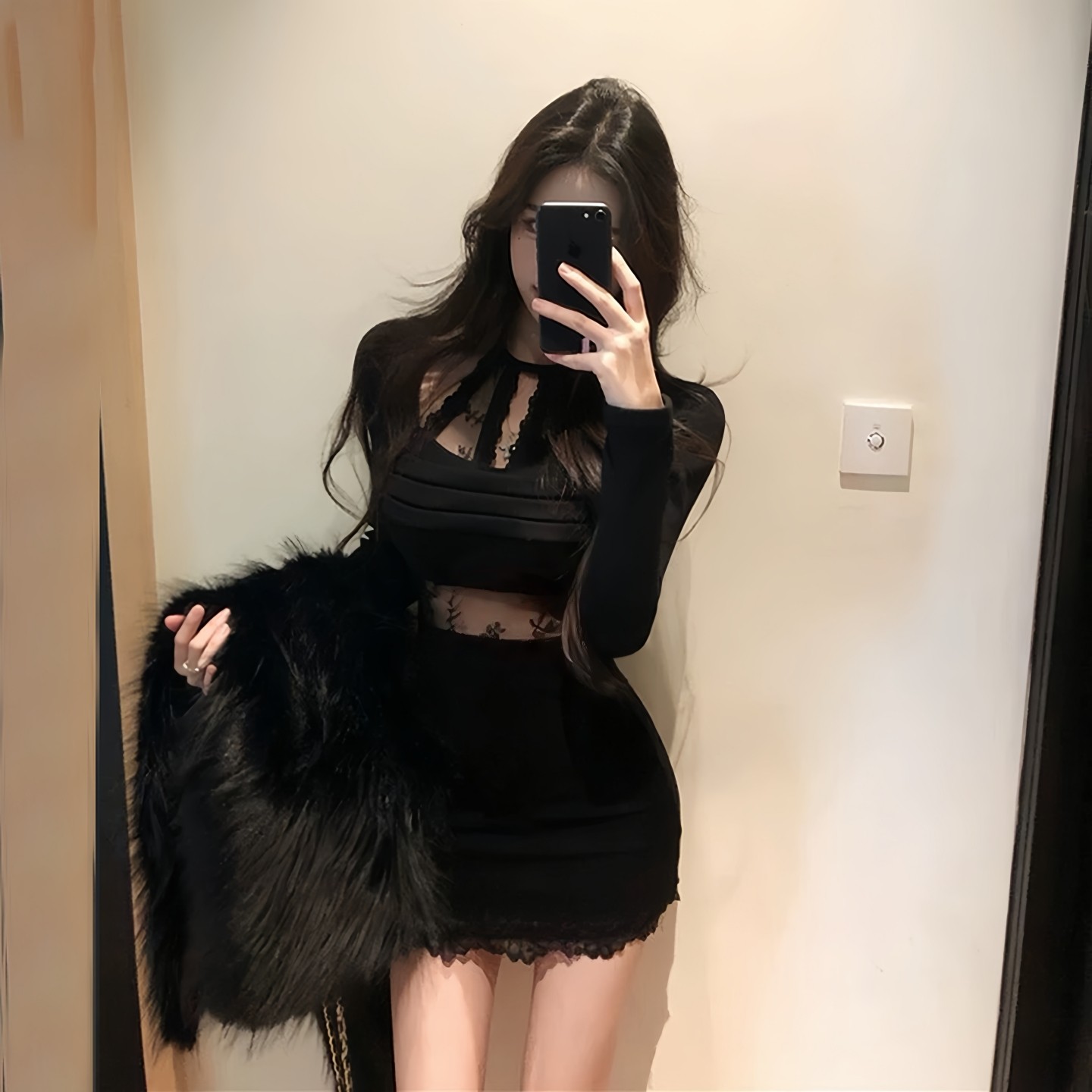 美式辣妹蕾丝拼接露背连衣裙秋冬新款性感修身显瘦黑色包臀打底裙