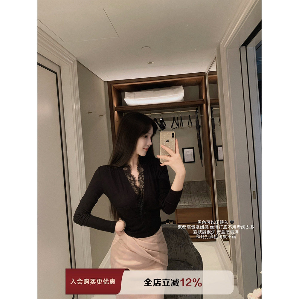 加绒衣女打底衫蕾丝性感保暖加厚女神衣V领内搭大码长袖修身显瘦