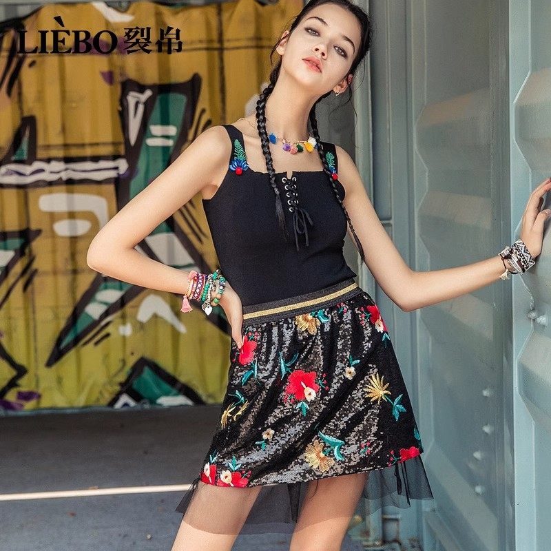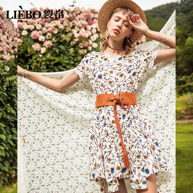 裂帛2020春季新款潮ins撞色拼接织带松紧腰垂坠雪纺百褶格纹裙女