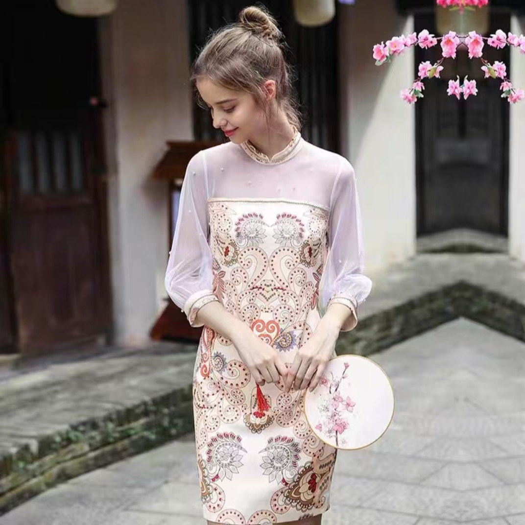 裂帛新衣记2023春秋立领七分袖旗袍印花民族风元素修身连衣裙
