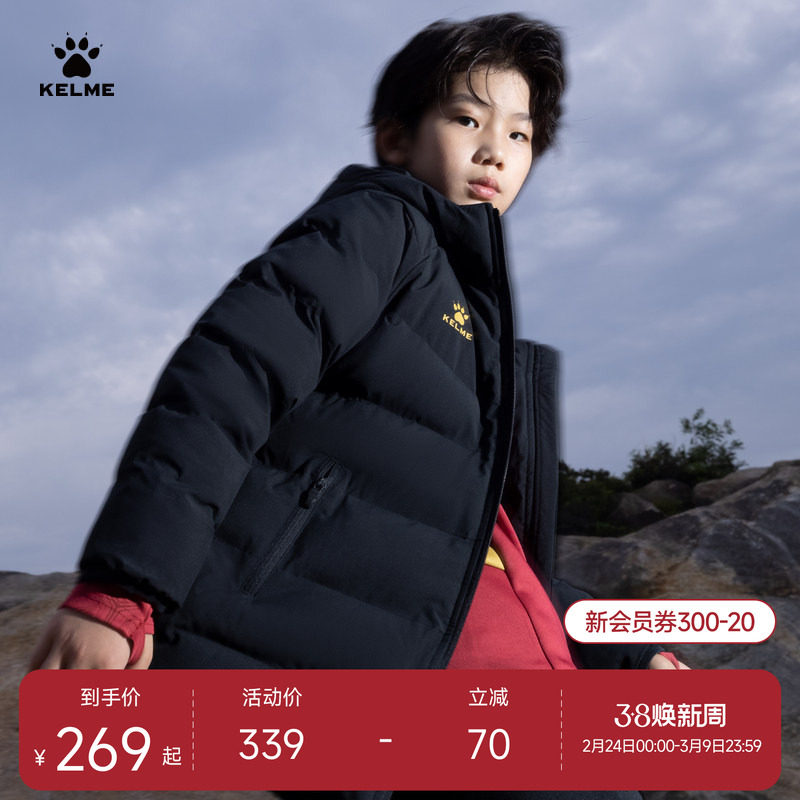 断码特价KELME卡尔美连帽长款棉服秋冬足球运动训练儿童棉大衣男