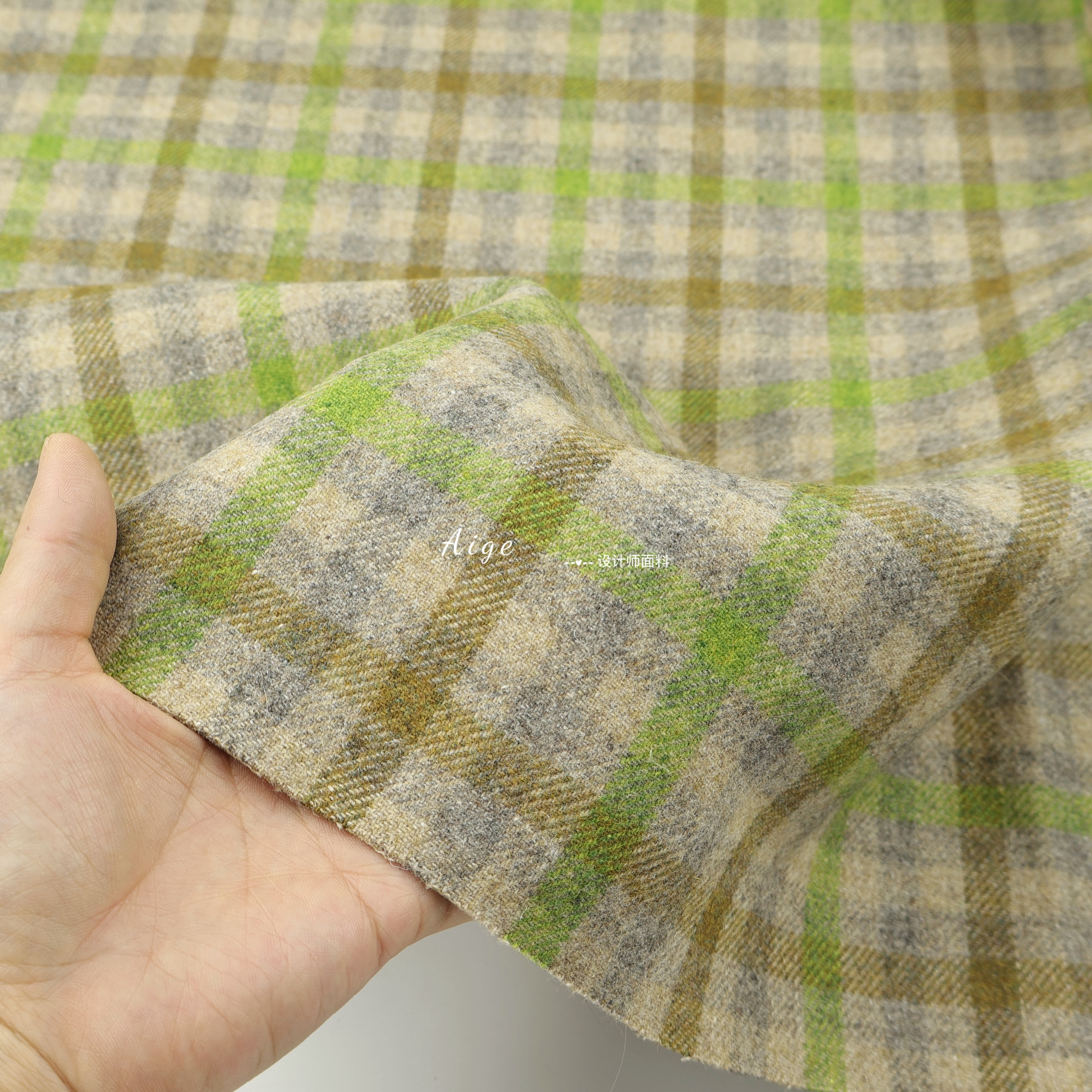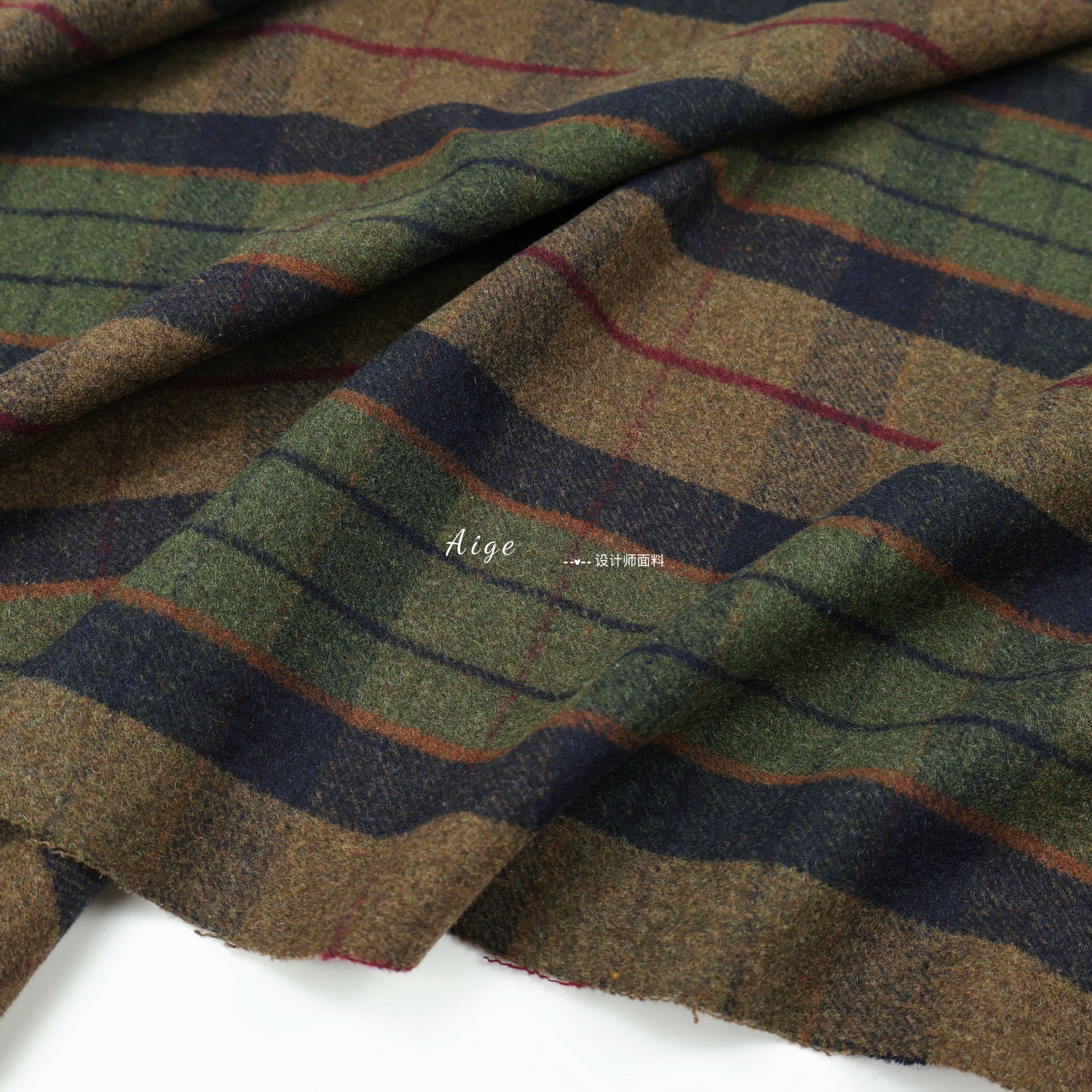 进口复古 绿棕色英伦格纹格子羊毛毛呢毛料面料西装大衣外套布料