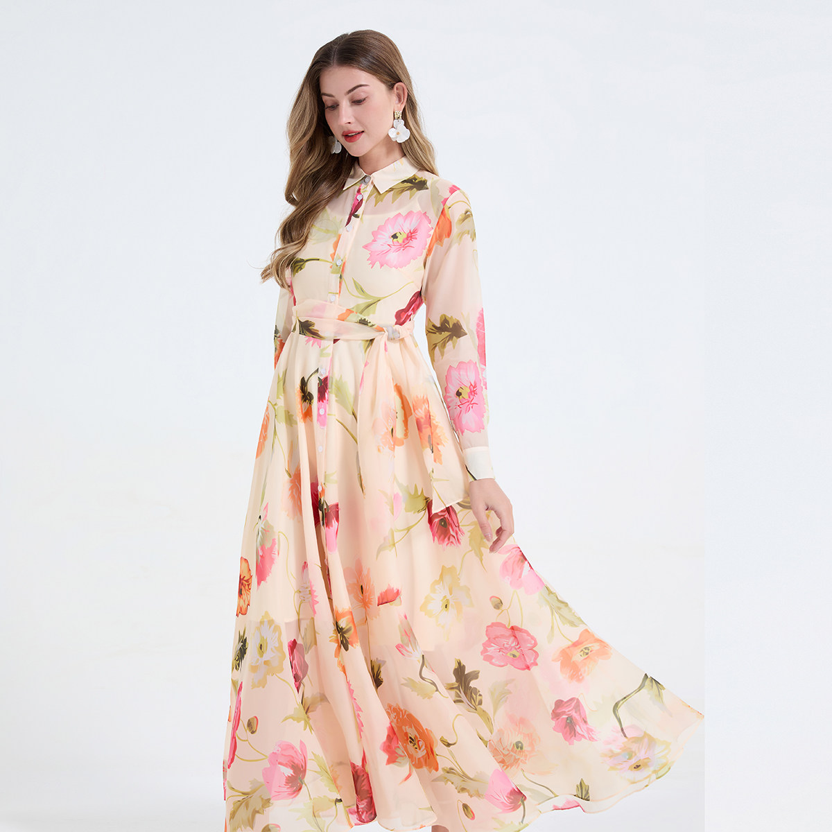 连衣裙女春长袖欧洲站欧美欧货时尚高级感洋气超长款过膝衬衫裙子
