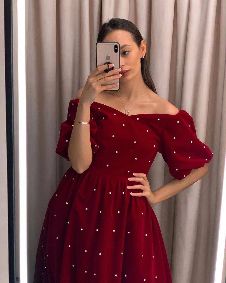 重工钉珠一字领泡泡袖连衣裙女法式复古收腰显瘦气质小个子丝绒裙
