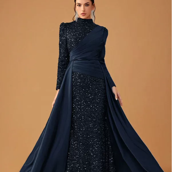 跨境欧美礼服长袖气质180高长款欧洲站宴会晚礼服黑色连衣裙长裙