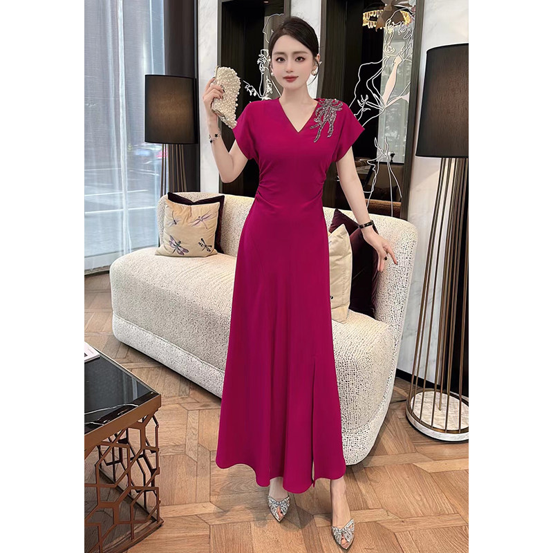 欧洲站女装重工烫钻优雅捏褶显瘦收腰大摆开叉长裙女神连衣裙夏装