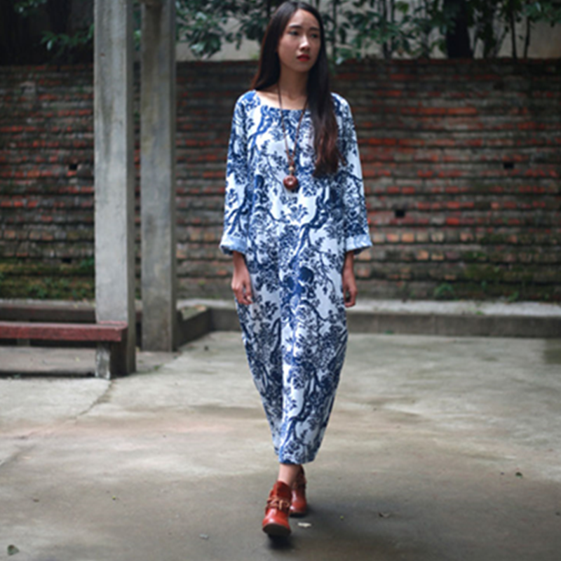 原创秋季女装新款复古文艺宽松中长款袍子连衣裙棉麻印花长袖裙子