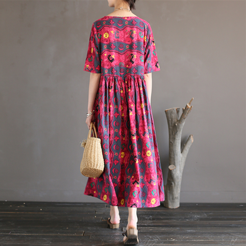 民族风棉麻印花连衣裙女原创春夏女装新款五分袖文艺复古长裙袍子