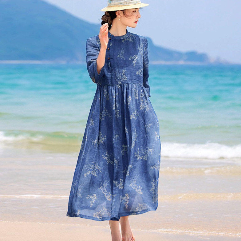 文艺棉麻女装2025夏新款中式苎麻印花连衣裙立领五分袖半开襟袍子