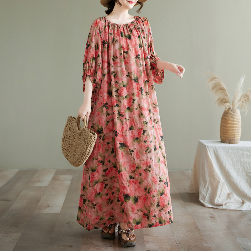 大码文艺棉麻印花连衣裙宽松遮肉显瘦度假风袍子大版型灯笼袖长裙