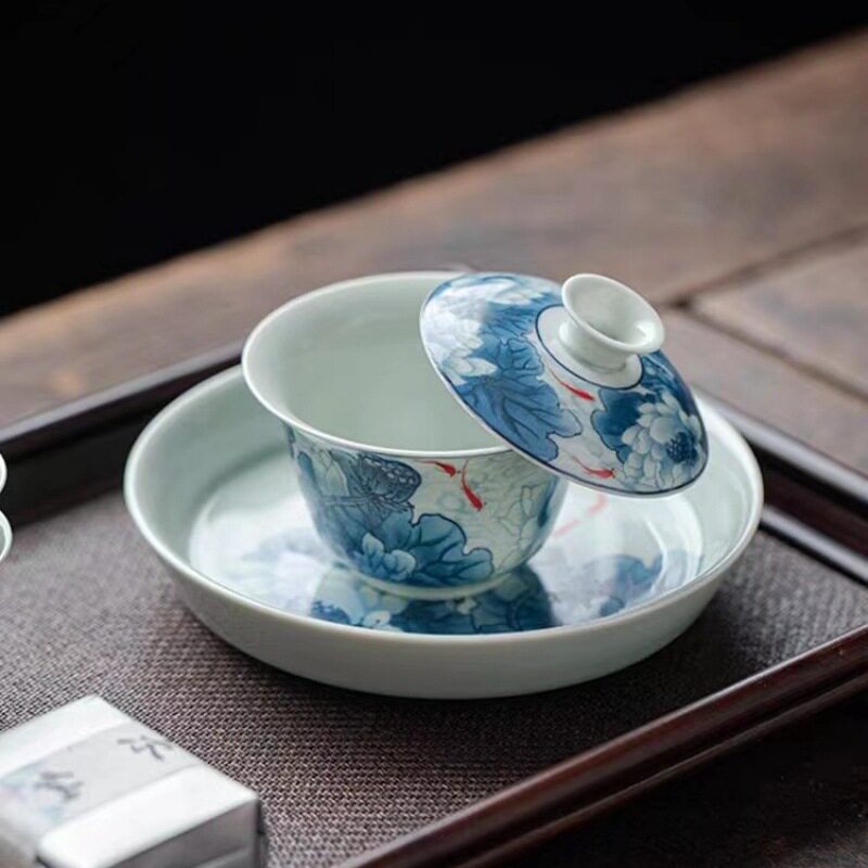 青花盖碗茶杯特价功夫茶具三才茶碗家用陶瓷手绘高档大泡茶壶悬停