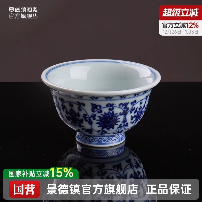 景德镇官方陶瓷手绘青花茶杯仿明永乐缠枝莲压手杯送礼茶具礼盒装