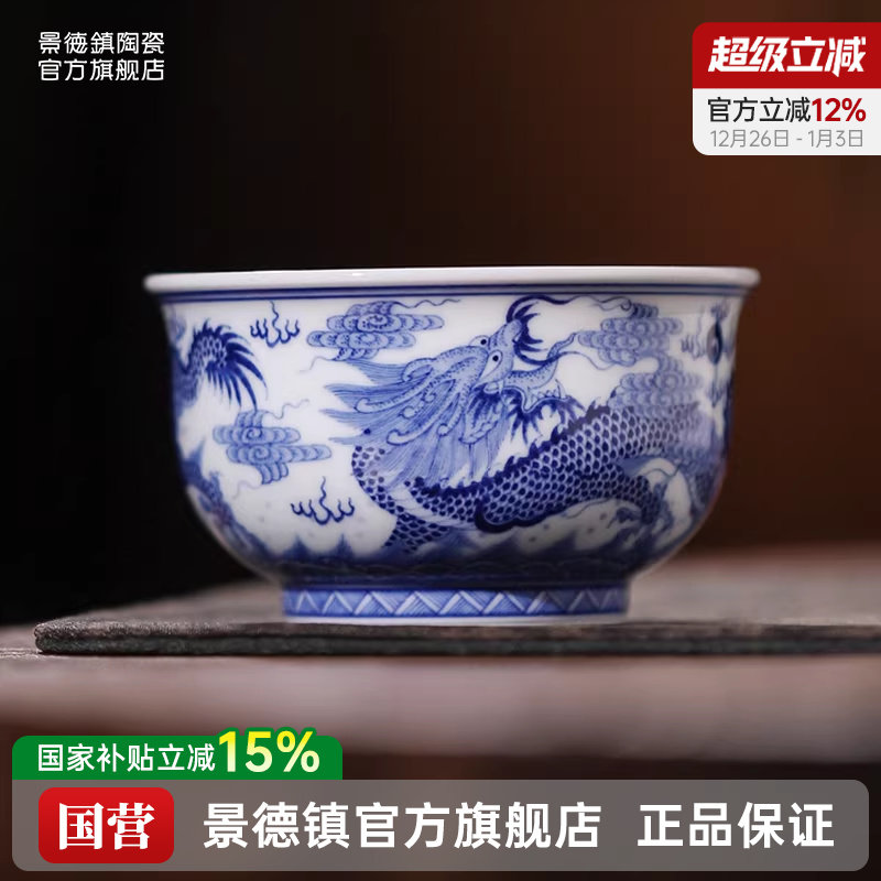 景德镇官方陶瓷大号主人品茗功夫杯龙凤杯茶中式高档复古青花茶杯