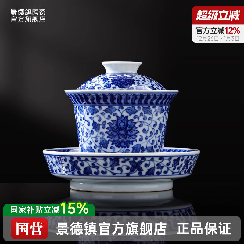 景德镇官方陶瓷釉下三才盖碗主人杯青花茶杯功夫茶具个人专用品茗