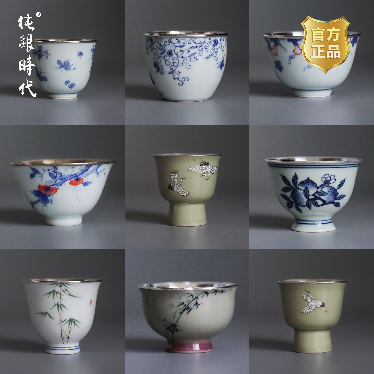 纯银时代 手绘青花瓷包银杯999足银主人杯个人杯景德镇青花茶杯