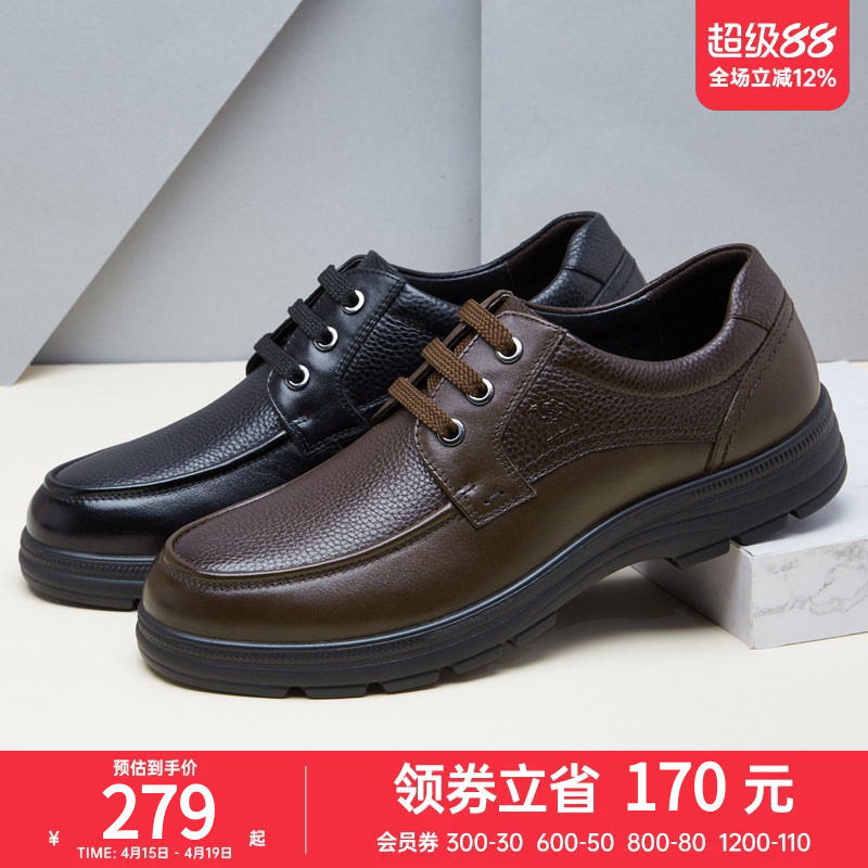 百丽男鞋真皮商务休闲鞋春秋新系带舒适百搭防滑圆头透气软底皮鞋