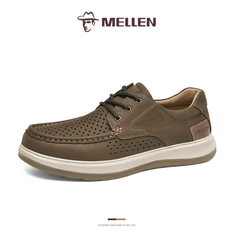 MELLEN名郎男鞋新款真皮透气软底休闲皮鞋百搭舒适镂空系带爸爸鞋