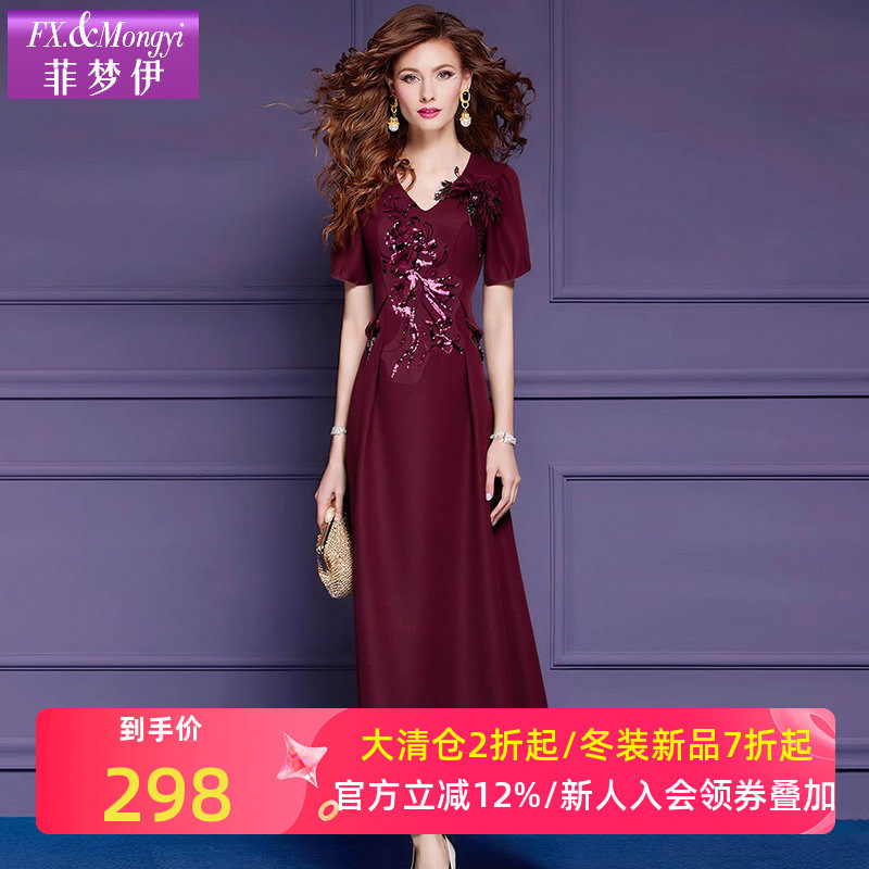菲梦伊亮片红色连衣裙女短袖夏装高端气质女神范修身V领长裙礼服