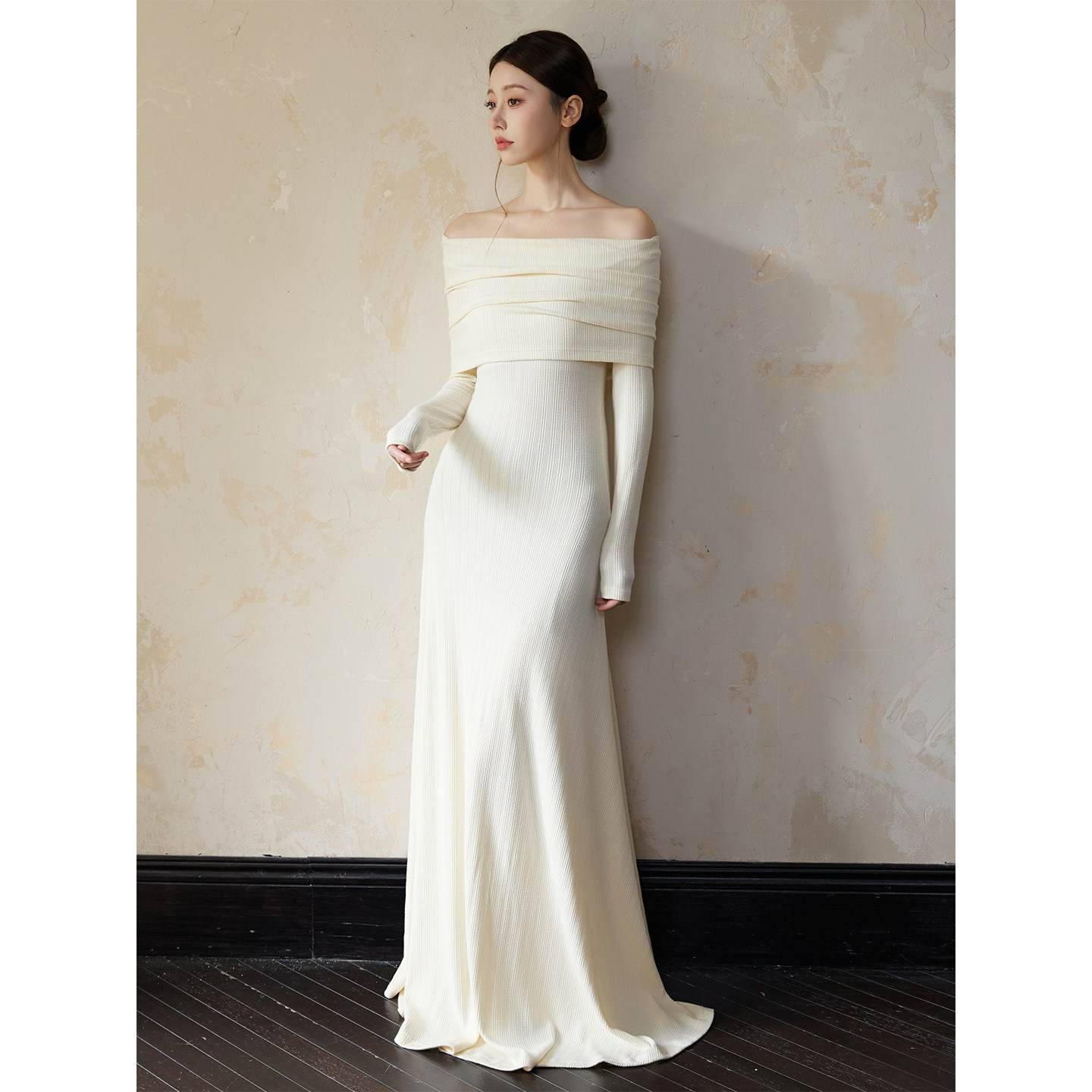 ONMOON 2025秋冬白月光女神一字肩针织内搭连衣裙 套头高弹长裙
