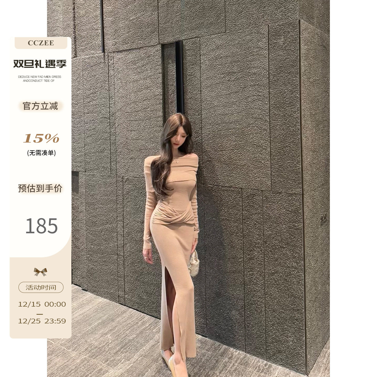 CCZEE【黛丝女神】一字肩连衣裙女秋季修身露肩显瘦开叉针织长裙