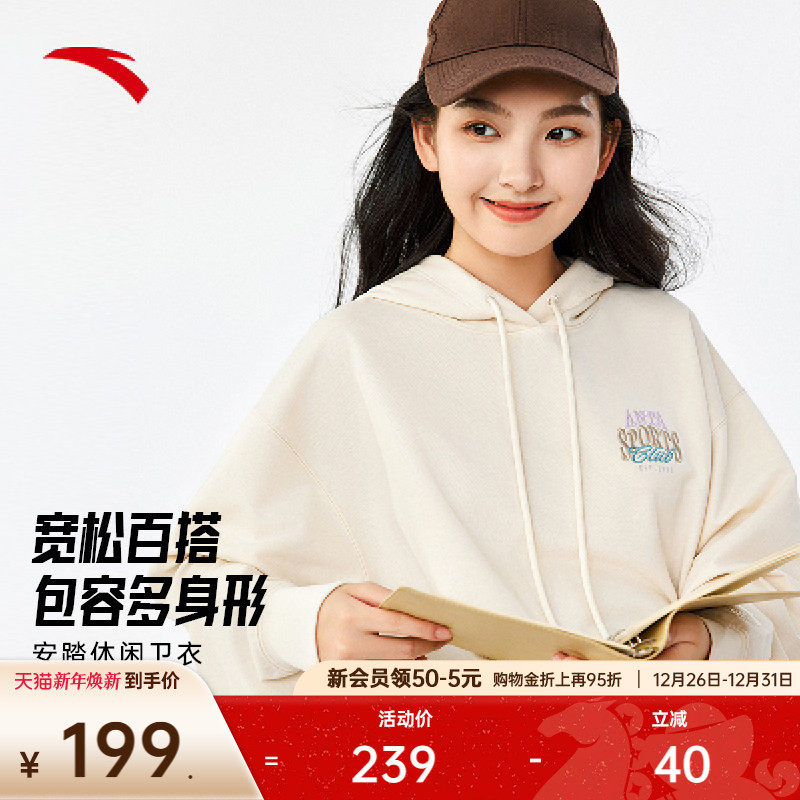 安踏学院风连帽卫衣女款冬季宽松圆领套头衫长袖休闲百搭运动上衣