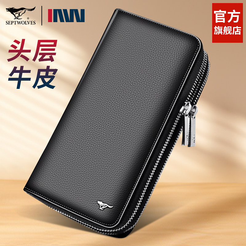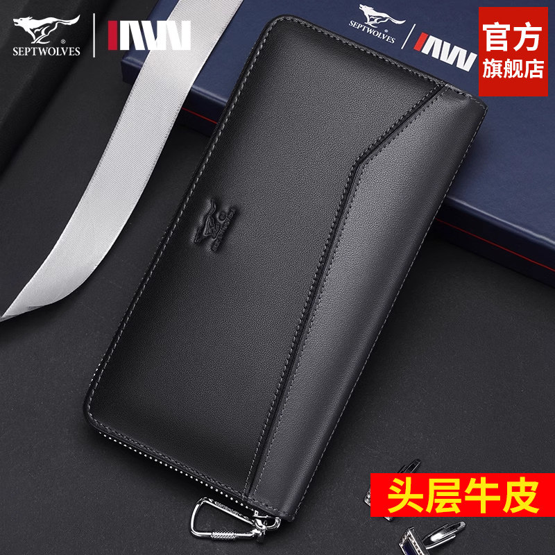 七匹狼长款钱包男真皮拉链钱包牛皮钱夹商务手拿包男士手抓包手包