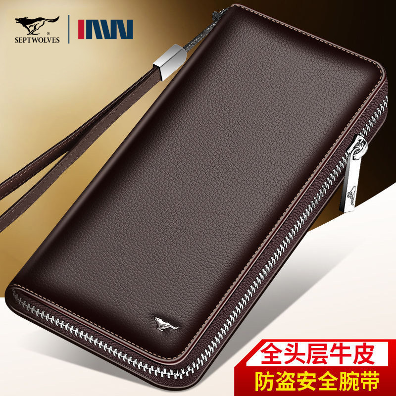 七匹狼长款钱包男士真皮拉链钱夹头层纯牛皮手包腕带手拿包韩版潮