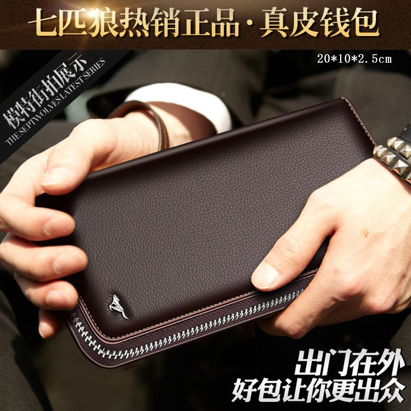 七匹狼手包男士长款纯钱包真皮双拉链手抓手拿包头层牛皮包韩版潮