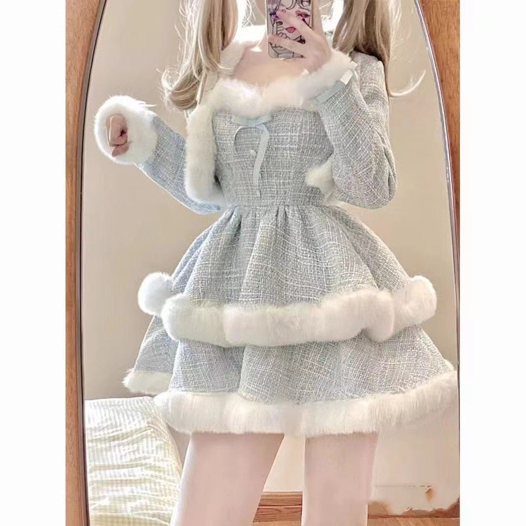 秋冬小香风名媛富家千金甜美毛毛蓬蓬连衣裙短款外套高级两件套装