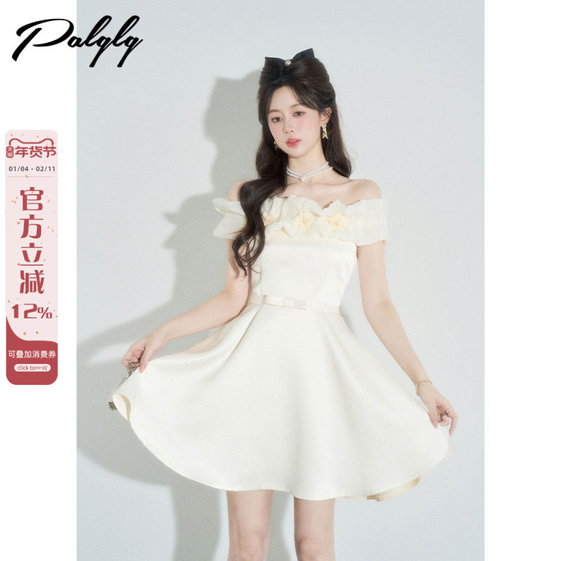法式气质名媛白色一字肩连衣裙女夏季高级感收腰显瘦蓬蓬小礼裙子