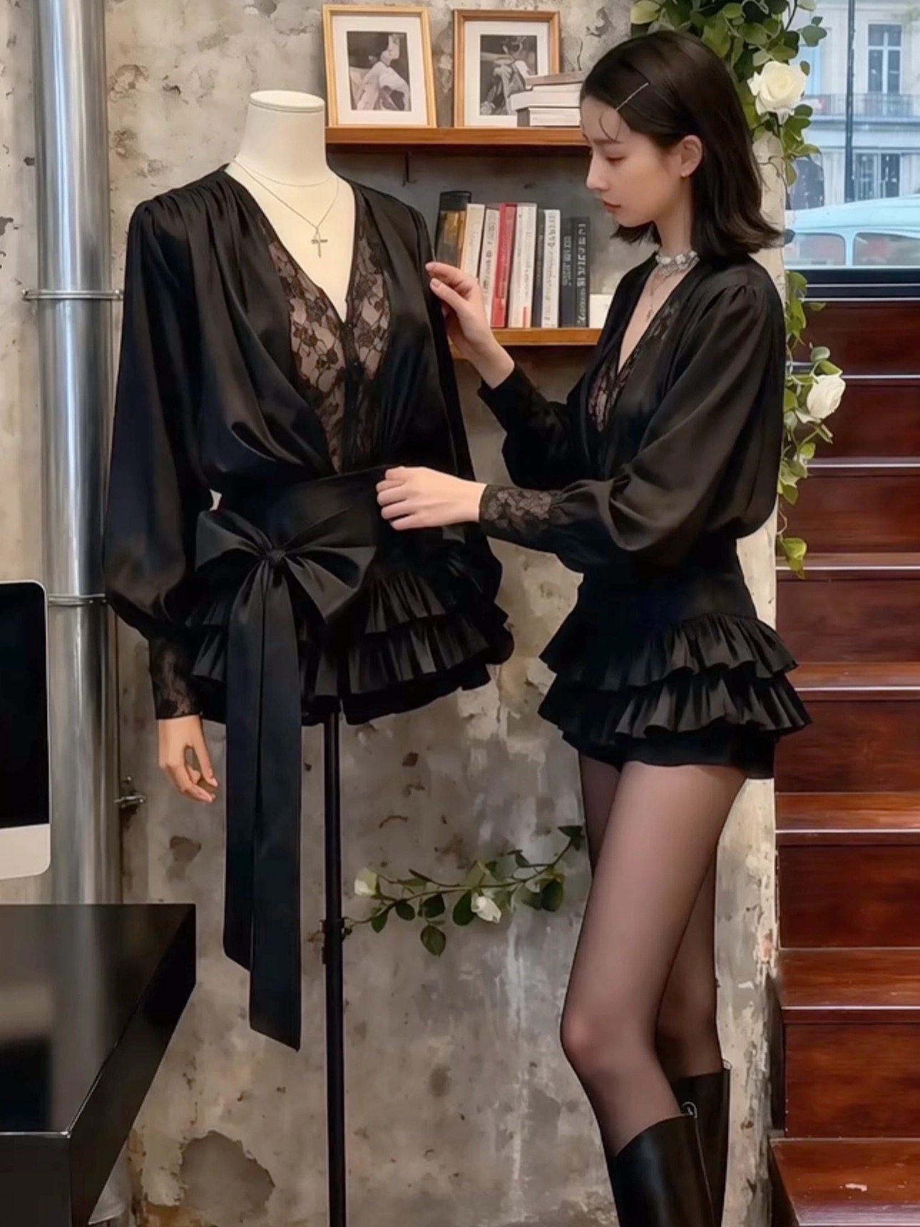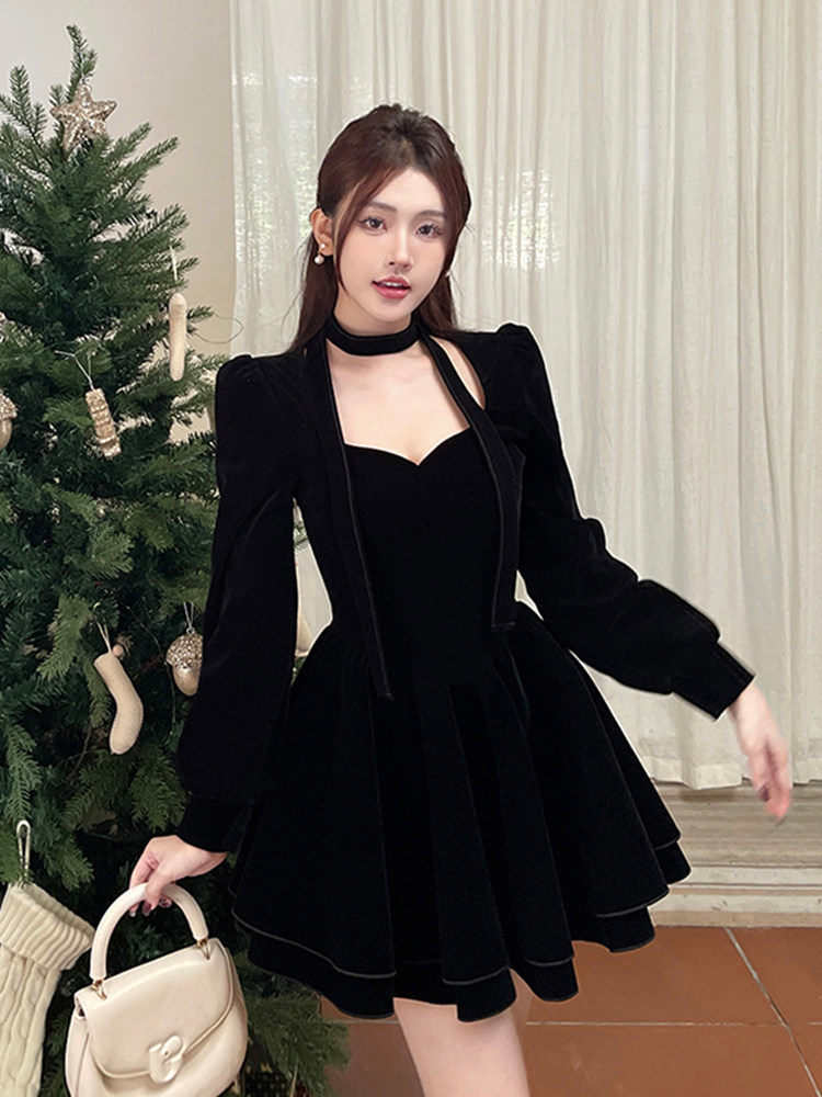 气质轻奢高级名媛长袖蕾丝连衣裙收腰修身蓬蓬裙黑色礼服裙公主裙