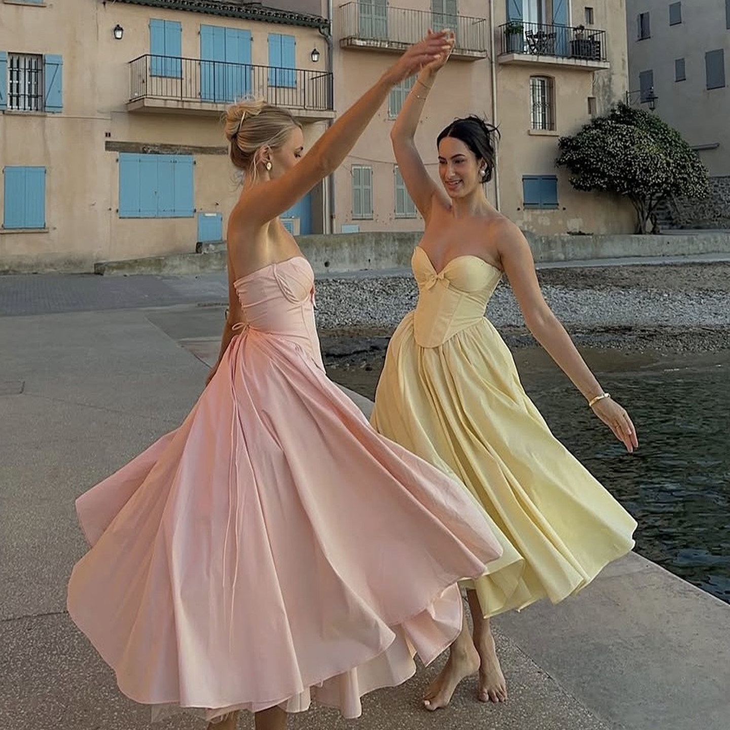 名媛千金名媛V领抹胸鱼骨收腰礼服连衣裙高腰长裙大裙摆蓬蓬裙夏