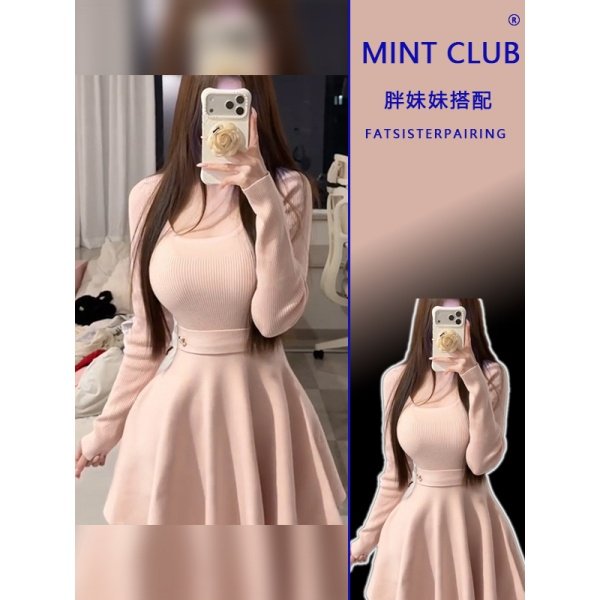 大码胖MM千金风针织连衣裙女春季高级感气质名媛收腰a字蓬蓬短裙