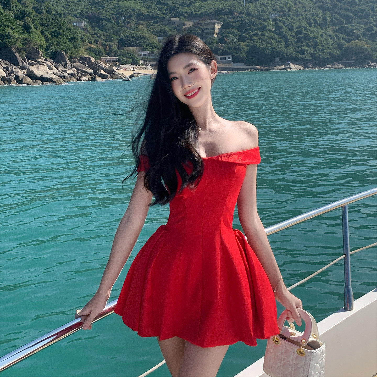 抹胸连衣裙名媛生日礼服裙新年战袍蓬蓬红色裙子海边度假拍照穿搭