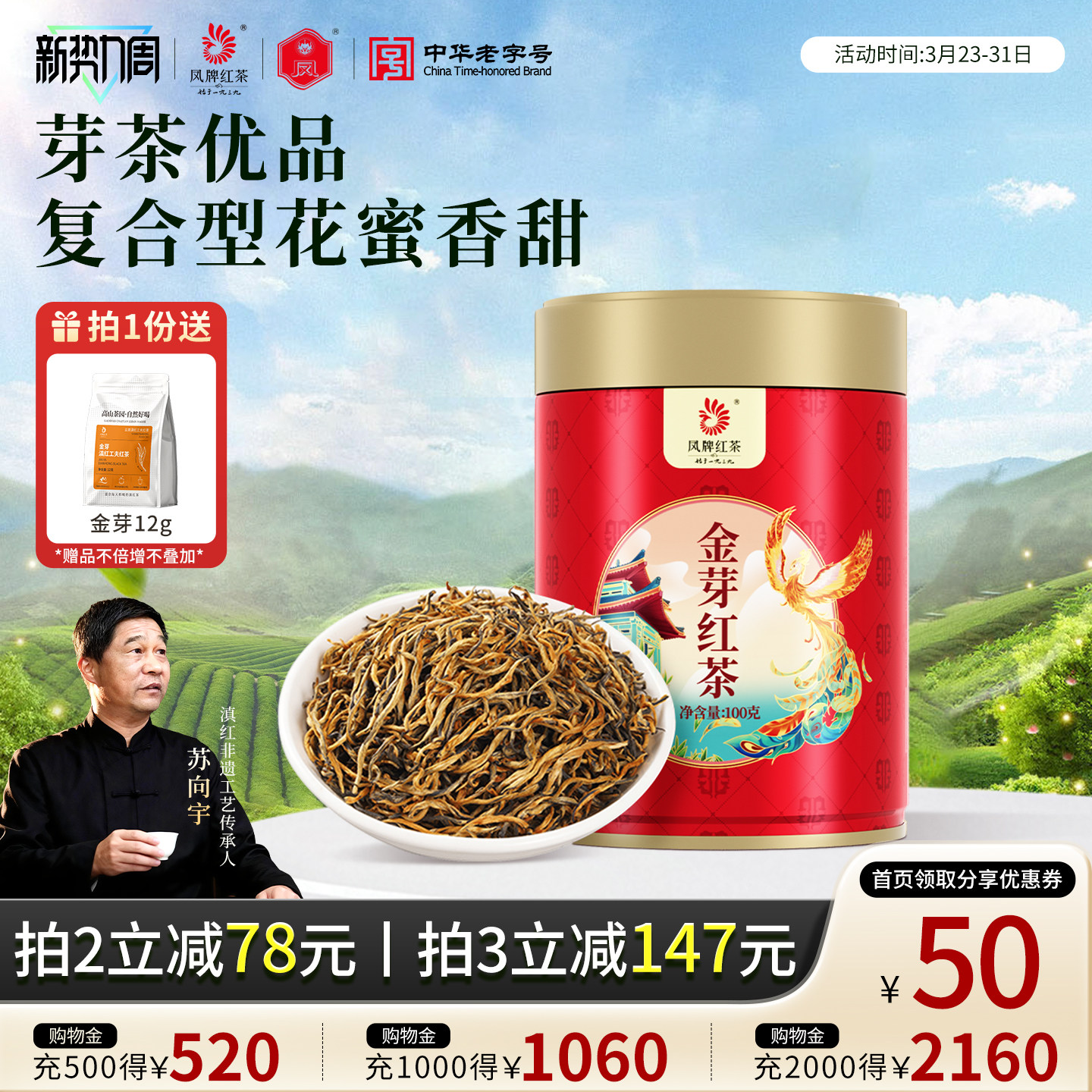 凤牌红茶叶云南正宗凤庆滇红金芽特级蜜香红茶100g罐装茶叶送礼品