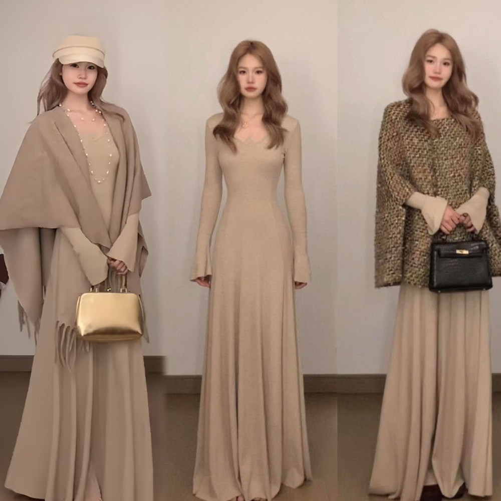2025秋冬v领长袖针织连衣裙女秋冬韩系收腰显瘦a字内搭打底长裙子