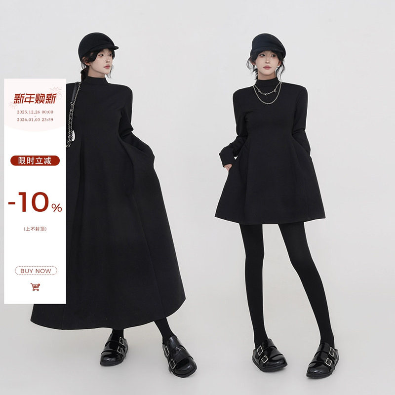 秋冬长袖半高领长裙子A字裙显瘦宽松外穿打底极简风黑色连衣裙女