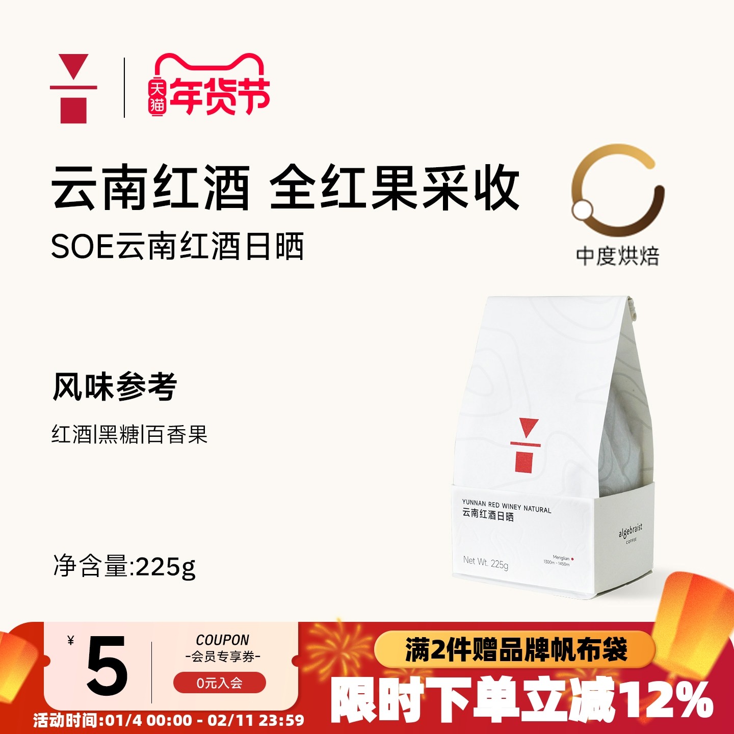 代数学家云南红酒日晒单品咖啡豆225g手冲普洱黑咖啡新鲜可磨粉
