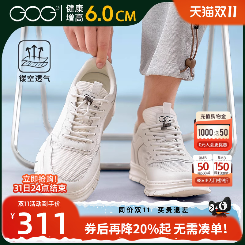 高尼10cm增高鞋男丨米白透气情侣休闲板鞋运动小白鞋厚底轻便男鞋