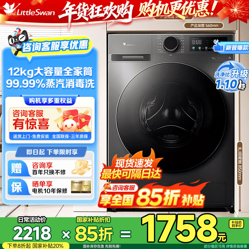 [纯平全嵌]小天鹅小乌梅3.0小钢炮全自动家用洗烘一体滚筒洗衣机