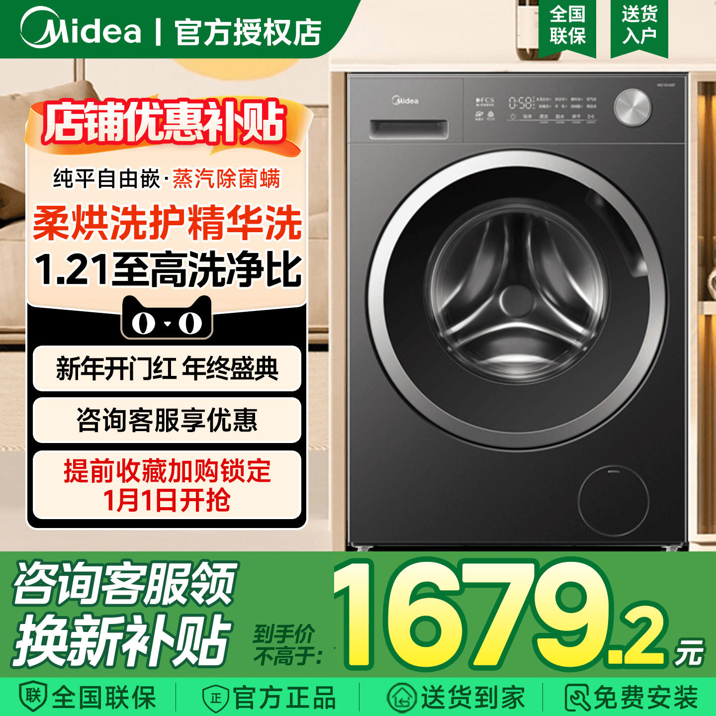 以旧换新补贴美的12kg直驱滚筒洗衣机全自动家用洗脱烘干一体930