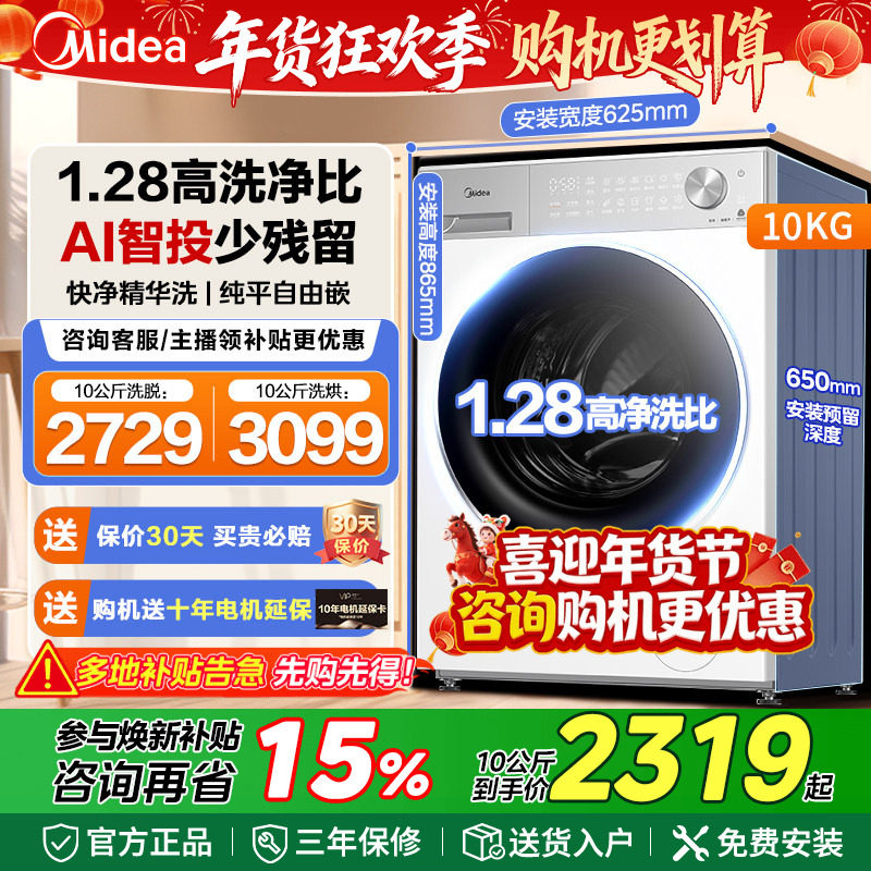 美的10kg滚筒洗衣机纯平嵌家用全自动洗脱洗烘一体大容量智投L1