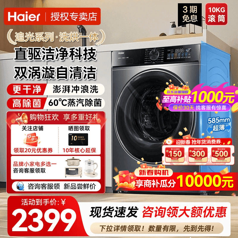 海尔滚筒洗衣机全自动10公斤大容量变频除菌一级节能变频洗脱一体