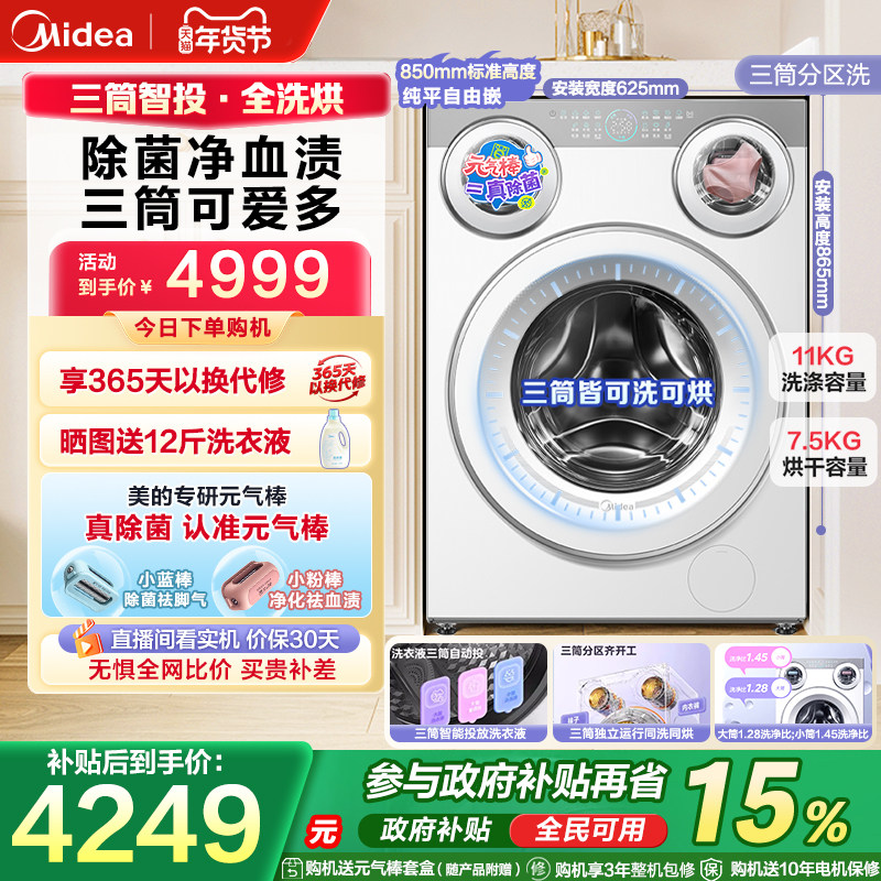 [全民补贴]美的可爱多三筒懒人分区滚筒洗衣机内衣裤除菌洗烘一体