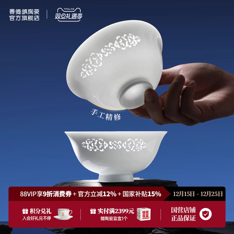 景德镇官方手工餐具陶瓷中式家用玲珑吃饭碗盘子高端套装不易挂油
