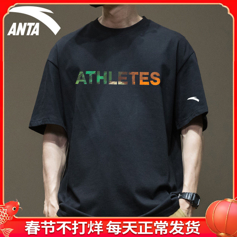 安踏短袖t恤男款夏季新款上衣宽松圆领大码休闲体恤衫黑色棉半袖