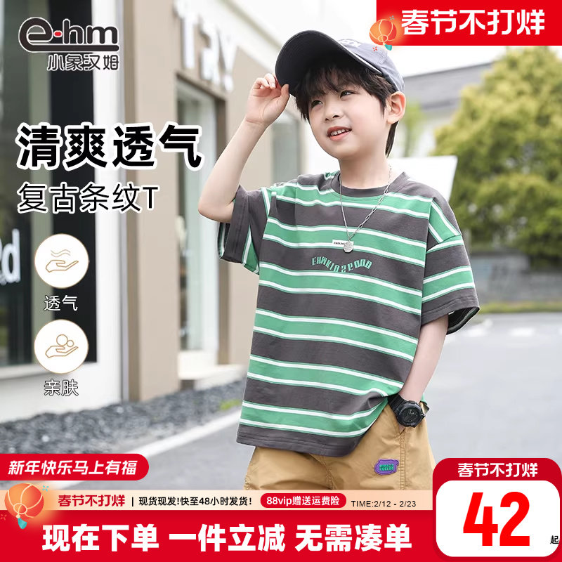 小象汉姆童装男童短袖T恤条纹儿童体恤衫半袖圆领2026夏装新款潮
